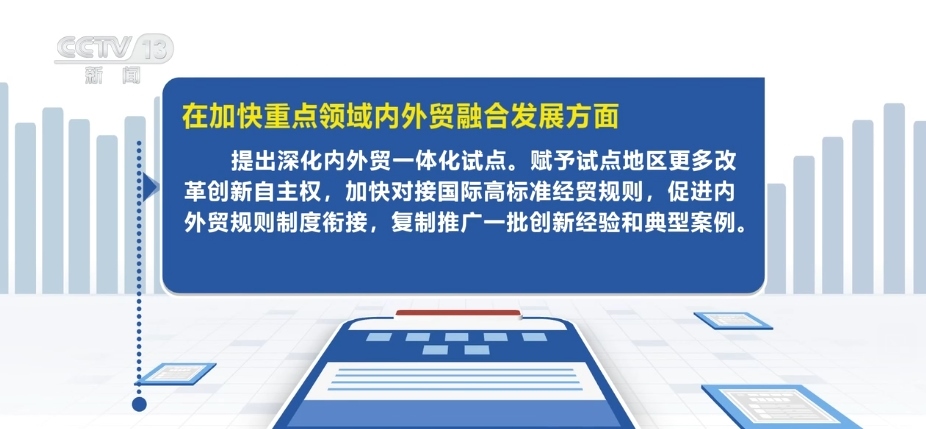 在加快重點(diǎn)領(lǐng)域內(nèi)外貿(mào)融合發(fā)展方面,提出深化內(nèi)外貿(mào)一體化試點(diǎn)。賦予試點(diǎn)地區(qū)更多改革創(chuàng)新自主權(quán),加快對接國際高標(biāo)準(zhǔn)經(jīng)貿(mào)規(guī)則,促進(jìn)內(nèi)外貿(mào)規(guī)則制度銜接,復(fù)制推廣一批創(chuàng)新經(jīng)驗和典型案例。