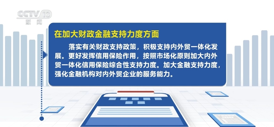 在加大財政金融支持力度方面,落實(shí)有關(guān)財政支持政策,積極支持內(nèi)外貿(mào)一體化發(fā)展。更好發(fā)揮信用保險作用,按照市場化原則加大內(nèi)外貿(mào)一體化信用保險綜合性支持力度。加大金融支持力度,強(qiáng)化金融機(jī)構(gòu)對內(nèi)外貿(mào)企業(yè)的服務(wù)能力。