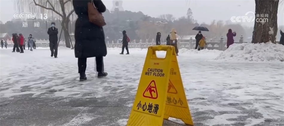 北海公園信息傳媒科副科長 張磊:主要是在門區(qū)、洗手間以及重點的景區(qū),同時我們也設(shè)置了“小心地滑”的這種提示牌130余處,此次降雪時間由于比較長,公園也采用了“機械+人工掃雪”的這種方式,爭取做到了隨掃隨清,保證主路的暢通。