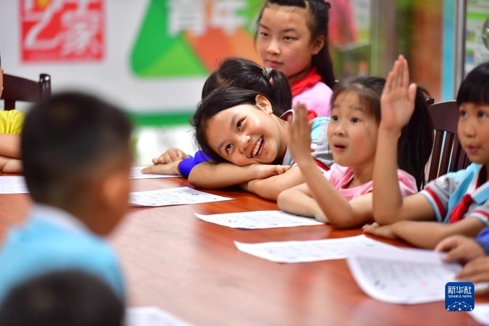 在廣西柳州市融水苗族自治縣易地扶貧搬遷安置小區(qū)苗家小鎮(zhèn)青年之家“六點小課堂”,孩子們參與興趣活動(2022年5月5日攝)。近年來,廣西柳州市融水苗族自治縣團縣委在易地扶貧搬遷安置小區(qū)苗家小鎮(zhèn)、苗美社區(qū)開設青年之家“六點小課堂”,定期組織青年志愿者,為這里的青少年開展功課輔導、自護教育、科技小課堂等活動。新華社記者 黃孝邦 攝