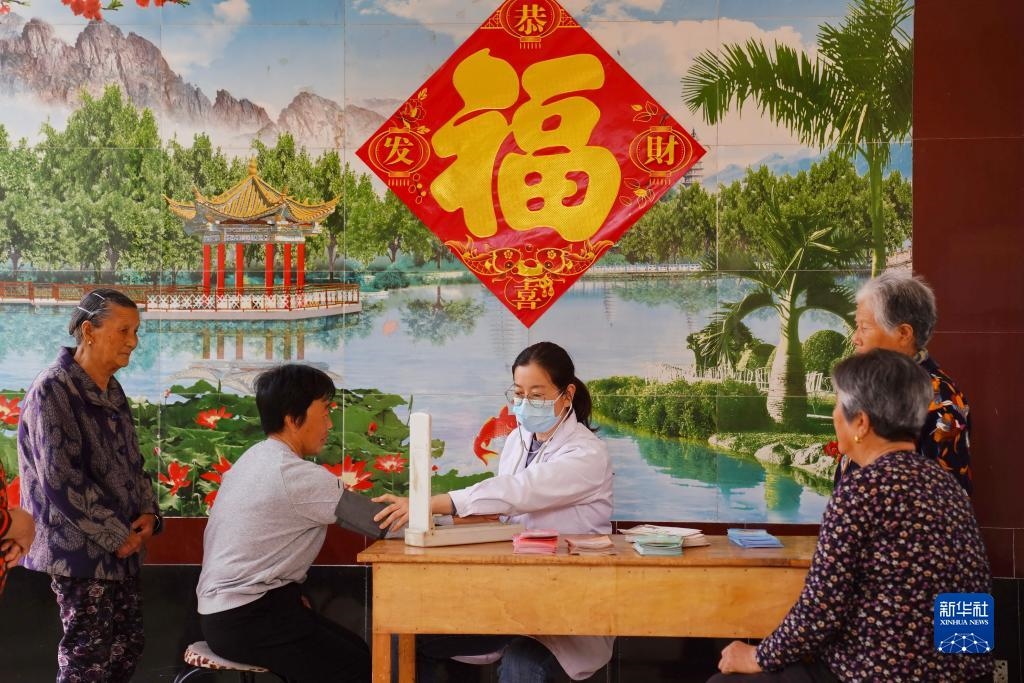 河北省平鄉(xiāng)縣尋召村村醫(yī)在“幸福小院”內為老人們量血壓(2023年4月20日攝)。近年來,河北省平鄉(xiāng)縣利用農村閑置院落,按照“就近集中、鄰里互助、抱團養(yǎng)老”的模式,采取社會捐助、鄉(xiāng)村籌集、縣財政補助等形式,先后打造出300余個“幸福小院”。新華社記者 牟宇 攝