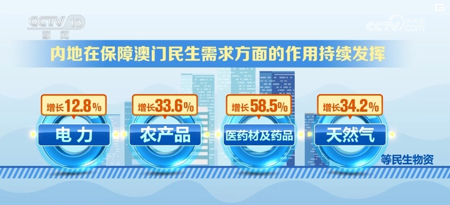 內(nèi)地對澳門出口商品結(jié)構(gòu)更加多元。2023年以來,內(nèi)地經(jīng)拱北海關(guān)對澳門地區(qū)出口機電產(chǎn)品74億元,占同期總值的37.4%,而1999年的比重不足10%。此外,電力、農(nóng)產(chǎn)品、醫(yī)藥材及藥品、天然氣等民生物資分別增長12.8%、33.6%、58.5%、34.2%,內(nèi)地在保障澳門民生需求方面的作用持續(xù)發(fā)揮。
