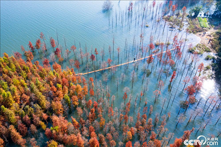 福建南平,延平區(qū)爐下鎮(zhèn)斜溪社區(qū)村洲頭島的落羽杉樹(shù)掩映閩江,色彩繽紛點(diǎn)綴冬日。