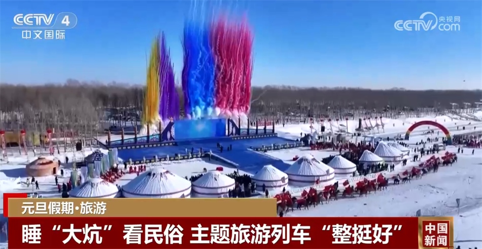 總臺(tái)央視記者 楊曜語(yǔ):我即將登上的列車就是從哈爾濱開(kāi)往漠河的國(guó)內(nèi)首個(gè)沉浸式東北民俗文化體驗(yàn)列車,坐過(guò)的人都說(shuō)一上車就想盤腿兒了,我們趕緊來(lái)體驗(yàn)一下!一上車我就被濃濃的東北文化所感染到了,整個(gè)車廂都被東北大花的經(jīng)典配色裝飾著,再加上隨手就能品嘗到東北特色美食,坐在床鋪上就感覺(jué)一秒鐘“穿越”到農(nóng)家炕頭。