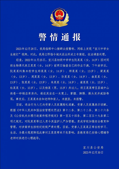 ·陜西宜川警方通報“宜川中學(xué)女生被打”:12人被責(zé)令嚴(yán)加管教。