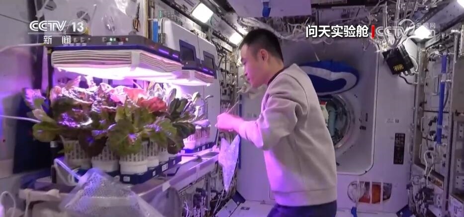 航天員 唐勝杰:你好,我正在對我們的櫻桃番茄進行授粉。因為太空沒有小蜜蜂,我就是那只小蜜蜂。大家看一看,這是我們的太空蔬菜,神十七乘組在“太空出差”期間,我們的太空菜園變得更大了,大家看看我們的蔬菜是不是長勢喜人?今天是新年的第一天,江新林為我們準備了營養(yǎng)豐盛的太空午餐,但是我覺得今天應該再增加一點綠色的、新鮮的蔬菜,午餐就會變得更豐盛了。大家可以看一看,看看我們的櫻桃番茄。誒,拿這兩杯,今天中午我們就吃這兩杯。