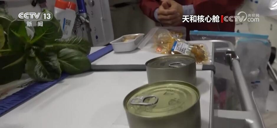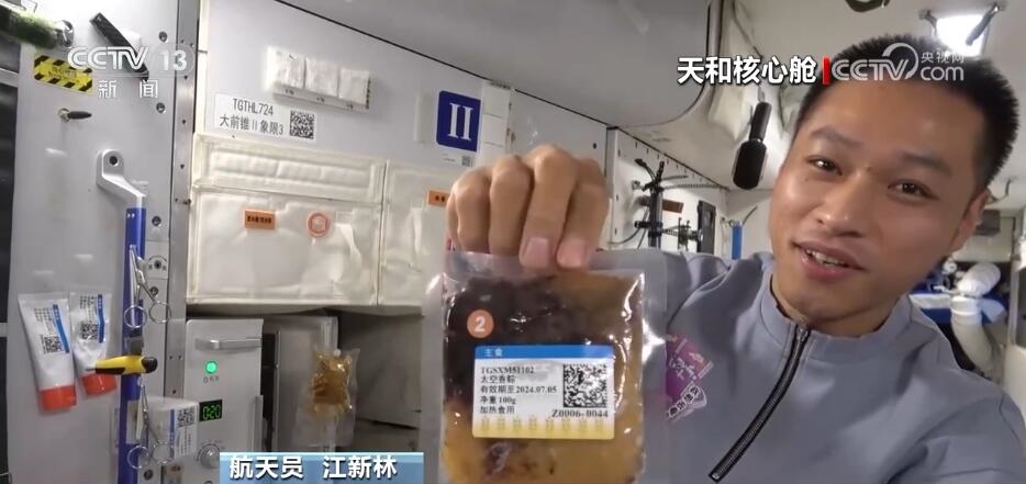 航天員 江新林:我是今天的太空美食家,讓我?guī)ьI大家一起來探索發(fā)現(xiàn)今天的太空美食。我們先看一下主食,熱乎乎的,看看里面都有什么吧,有01最愛吃的白米飯,小心燙哦,02愛吃的面條,我的炒飯。好了,把它粘在餐桌上。然后再讓我們看看我為他們準備的驚喜。看看這是什么?這是我們冬至特意結余的餃子,還有蔬菜副食。地面上的工作人員考慮得特別周到,按照個人的口味為我們準備了美味的食品,而且將它們塑封包裝,給我們節(jié)余時間的時候又保證它的口味。這是網紅太空香粽,大家印象比較深刻吧,還有這個年糕也是特別好吃、特別美味,還有紅燴豬排,保證有足夠的蛋白質攝入量。很豐盛。請看這里,我們特意留了一些新鮮的水果,看看都有什么吧,有美味的蘋果,還有葡萄,大家這個都特別愛吃,我們三個在一起分享一下。