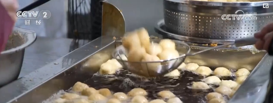 在鹽城市建湖縣的一家魚圓門店里,工人們正在炸制魚圓。分裝、稱重、封口后,不一會兒工人們就把包裝好的魚圓擺滿了工作臺。