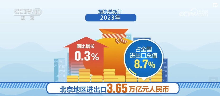 據(jù)海關(guān)統(tǒng)計,2023年,北京地區(qū)進(jìn)出口3.65萬億元人民幣,同比增長0.3%,占全國進(jìn)出口總值的8.7%。