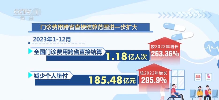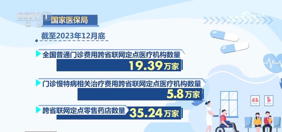 截至2023年12月底,全國普通門診費用跨省聯(lián)網(wǎng)定點醫(yī)療機構(gòu)數(shù)量為19.39萬家,門診慢特病相關(guān)治療費用跨省聯(lián)網(wǎng)定點醫(yī)療機構(gòu)數(shù)量為5.8萬家,跨省聯(lián)網(wǎng)定點零售藥店數(shù)量為35.24萬家,分別較2022年底增長118.6%、305.59%、55.79%。門診費用跨省直接結(jié)算范圍進(jìn)一步擴大。2023年1—12月,全國門診費用跨省直接結(jié)算1.18億人次,減少個人墊付185.48億元,分別較2022年增長263.36%、295.9%。