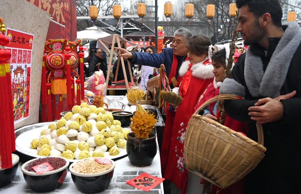 2月2日,在西安永興坊舉行的小年活動上,來自西安各大學的留學生在民俗專家的講解下了解小年祭灶所用的物品。新華社記者 劉瀟 攝