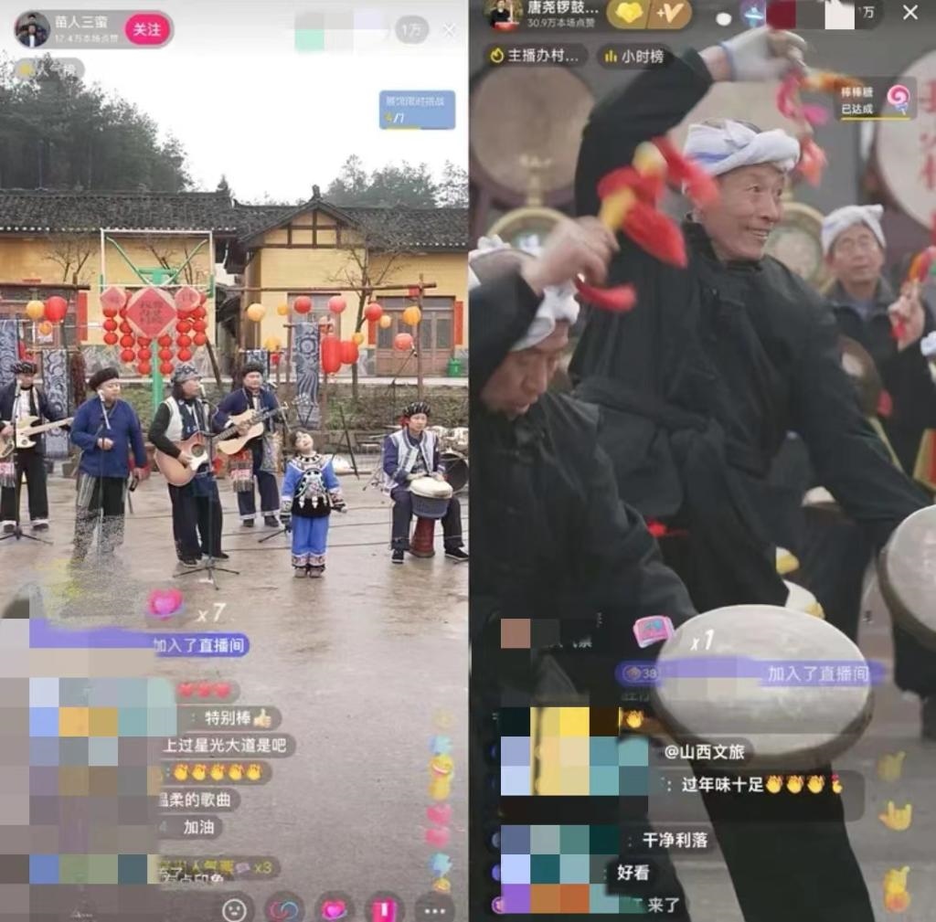 湖南省鳳凰縣臘爾山鎮(zhèn)苗寨中,4個“90后”苗族小伙組成樂隊自辦“村晚”,規(guī)模不大,唱火家鄉(xiāng);山西臨汾的村民們用簸箕、黃豆當樂器,配合嗩吶和非遺晉南威風鑼鼓,直播連線上千公里外的苗鄉(xiāng),南北大聯(lián)歡釋放獨特的精彩,吸引在線觀眾近800萬人……