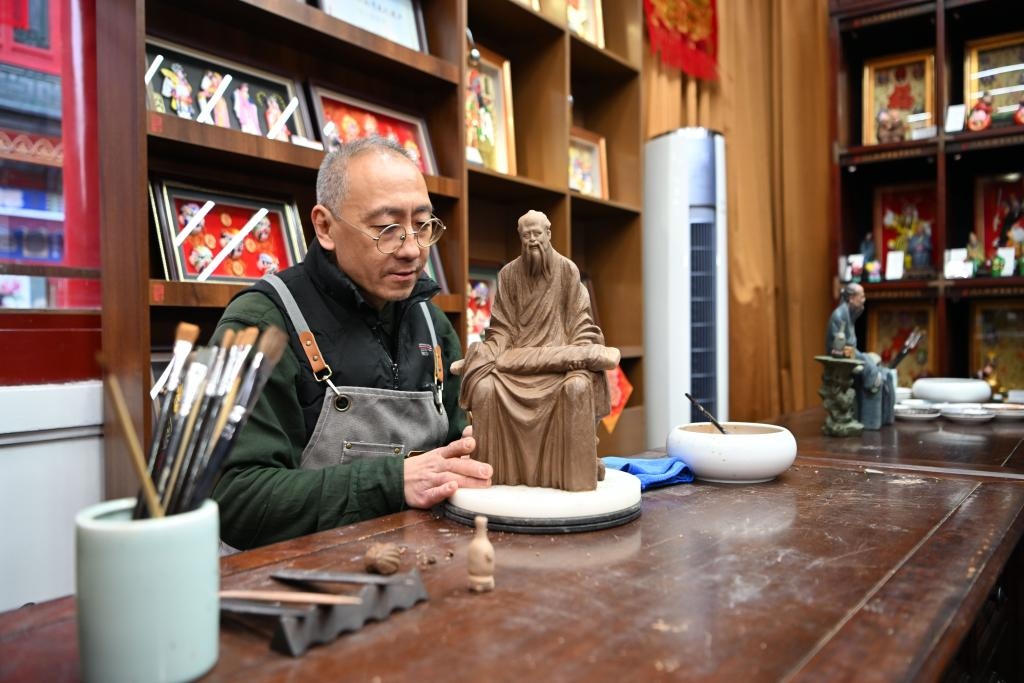 在天津古文化街,泥人張制作部的師傅劉強(qiáng)在店內(nèi)工作。新華社記者李然 攝
