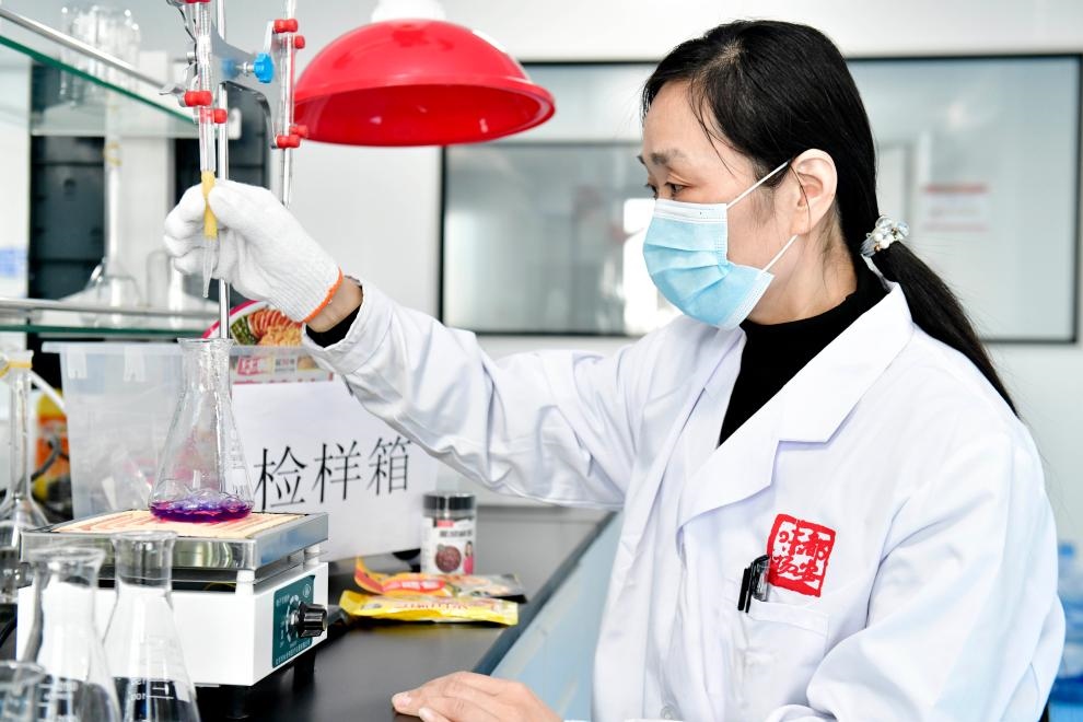 工作人員在樂陵市調(diào)味品產(chǎn)業(yè)共享實(shí)驗(yàn)室對(duì)送樣調(diào)味品進(jìn)行檢測(cè)。新華社記者 郭緒雷 攝