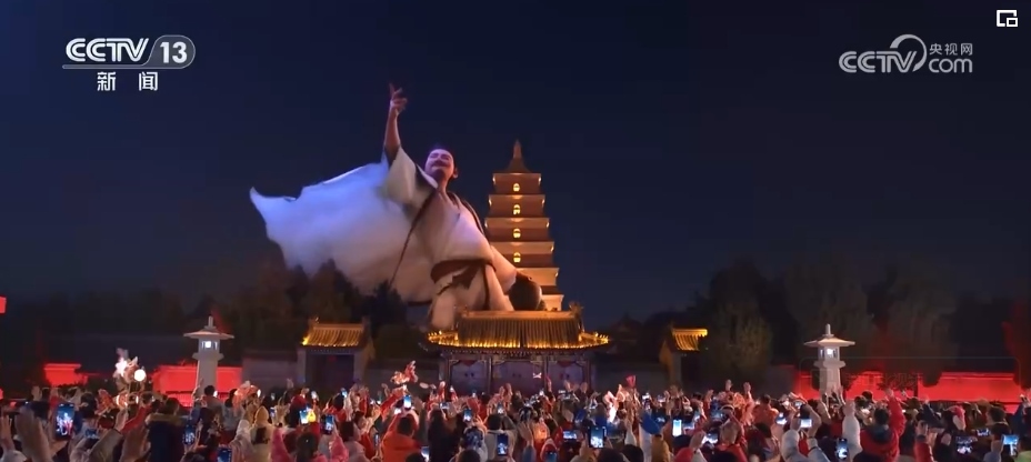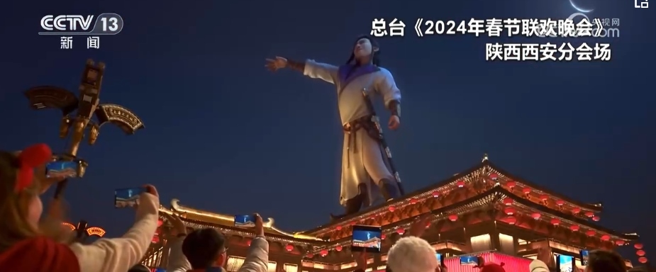 除夕當(dāng)晚9時(shí),西安分會(huì)場(chǎng)《山河詩(shī)長(zhǎng)安》篇章的“打開(kāi)方式”讓人眼前一亮。在科技助力下,“詩(shī)仙”李白跨越歲月長(zhǎng)河“穿越”而來(lái),在煙火璀璨中,隨著熙熙攘攘的人群一起走進(jìn)西安城墻永寧門(mén),走入千年后的耀眼長(zhǎng)安。