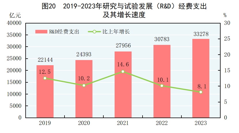 全年研究與試驗發(fā)展(R&D)經(jīng)費支出33278億元,比上年增長8.1%,與國內(nèi)生產(chǎn)總值之比為2.64%,其中基礎(chǔ)研究經(jīng)費2212億元,比上年增長9.3%,占R&D經(jīng)費支出比重為6.65%。國家自然科學基金共資助5.25萬個項目。截至年末,納入新序列管理的國家工程研究中心207個,國家企業(yè)技術(shù)中心1798家。國家科技成果轉(zhuǎn)化引導基金累計設(shè)立36只子基金,資金總規(guī)模624億元。國家級科技企業(yè)孵化器[64]1606家,國家備案眾創(chuàng)空間[65]2376家。全年授予發(fā)明專利權(quán)92.1萬件,比上年增長15.3%。PCT專利申請受理量[66]7.4萬件。截至年末,有效發(fā)明專利499.1萬件,比上年末增長18.5%。每萬人口高價值發(fā)明專利擁有量[67]11.8件。全年商標注冊438.3萬件,比上年下降29.0%。全年共簽訂技術(shù)合同95萬項,技術(shù)合同成交金額61476億元,比上年增長28.6%。我國公民具備科學素質(zhì)[68]的比例達到14.14%。