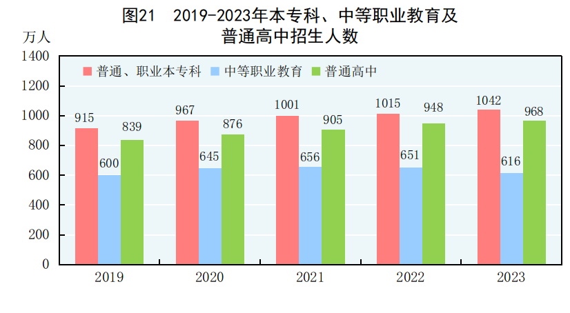 全年研究生教育招生130.2萬人,在學研究生388.3萬人,畢業(yè)生101.5萬人。普通、職業(yè)本???sup>[70]招生1042.2萬人,在校生3775.0萬人,畢業(yè)生1047.0萬人。中等職業(yè)教育[71]招生616.5萬人,在校生1737.9萬人,畢業(yè)生537.1萬人。普通高中招生967.8萬人,在校生2803.6萬人,畢業(yè)生860.4萬人。初中招生1754.6萬人,在校生5243.7萬人,畢業(yè)生1623.6萬人。普通小學招生1877.9萬人,在校生10836.0萬人,畢業(yè)生1763.5萬人。特殊教育招生15.5萬人,在校生91.2萬人,畢業(yè)生17.3萬人。學前教育在園幼兒4093.0萬人。九年義務(wù)教育鞏固率為95.7%,高中階段毛入學率為91.8%。