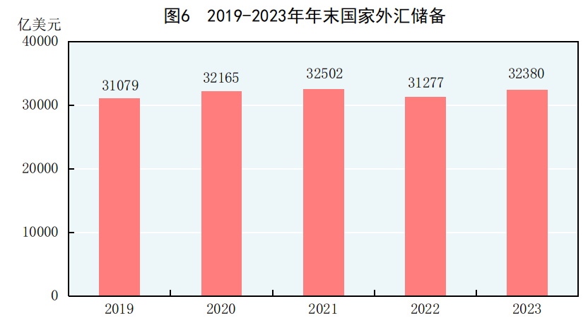 年末國家外匯儲備32380億美元,比上年末增加1103億美元。全年人民幣平均匯率為1美元兌7.0467元人民幣,比上年貶值4.5%。