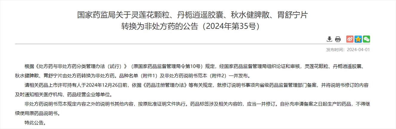 央視網消息:日前國家藥監(jiān)局網站發(fā)布公告,根據《處方藥與非處方藥分類管理辦法(試行)》(原國家藥品監(jiān)督管理局令第10號)規(guī)定,經國家藥品監(jiān)督管理局組織論證和審核,靈蓮花顆粒、丹梔逍遙膠囊、秋水健脾散、胃舒寧片由處方藥轉換為非處方藥。