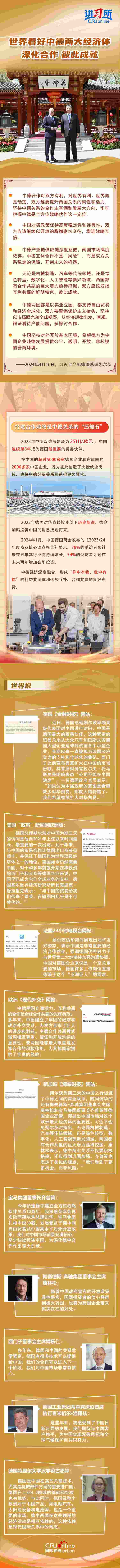 今年是中德建立全方位戰(zhàn)略伙伴關(guān)系10周年,也是朔爾茨就任德國(guó)總理以來(lái)第二次訪華。為進(jìn)入此次訪華隨行的經(jīng)濟(jì)代表團(tuán),德國(guó)企業(yè)界報(bào)名非常踴躍,最終拿到“登機(jī)牌”的都是各行業(yè)巨頭的高管,展現(xiàn)了德國(guó)商界對(duì)中國(guó)市場(chǎng)的信心,國(guó)際輿論對(duì)中德兩大經(jīng)濟(jì)體雙向奔赴作出積極解讀。