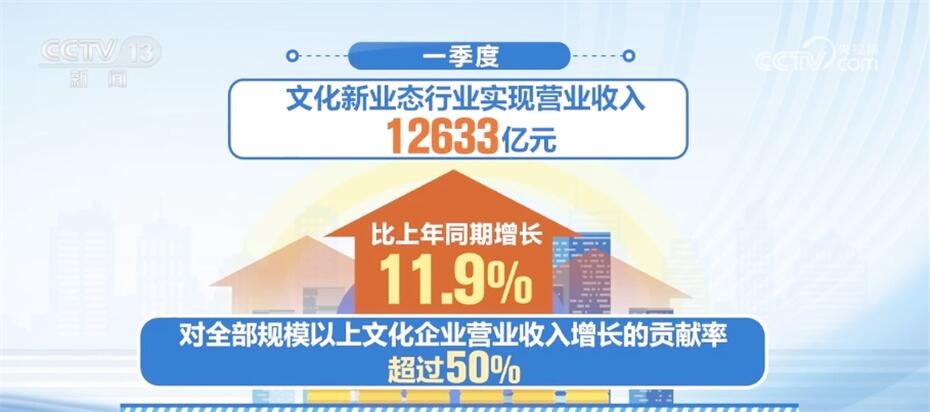 文化新業(yè)態(tài)行業(yè)持續(xù)發(fā)揮帶動(dòng)效應(yīng),一季度,文化新業(yè)態(tài)行業(yè)實(shí)現(xiàn)營(yíng)業(yè)收入12633億元,比上年同期增長(zhǎng)11.9%,對(duì)全部規(guī)模以上文化企業(yè)營(yíng)業(yè)收入增長(zhǎng)的貢獻(xiàn)率超過50%。