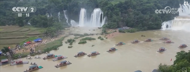 水量大增的瀑布奔騰而下沖擊著河面水聲轟鳴,慕名前來的游客們或乘坐竹筏感受瀑布的恢弘氣勢,或?qū)ふ易罴褭C(jī)位與瀑布“打卡”合影。除了近距離觀賞德天跨國瀑布,也有不少游客選擇跨境游玩,站在越南境內(nèi)的板約瀑布看德天瀑布,以不同視角體驗中越風(fēng)情。