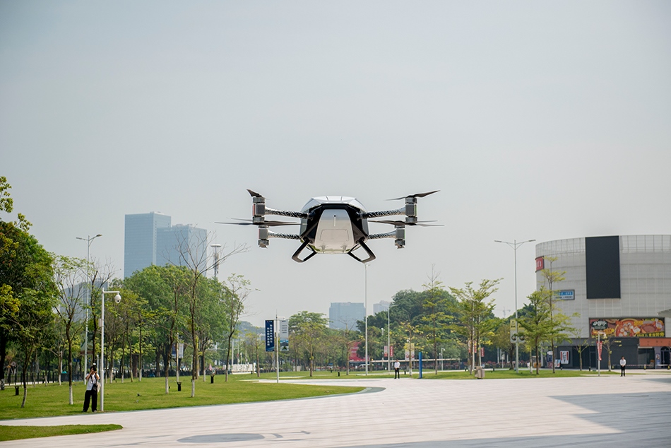 5月15日,在廣州市番禺區(qū)小鵬匯天總部,飛行汽車(chē)旅航者X2在進(jìn)行飛行演示。 新華社記者 徐嘉懿 攝
