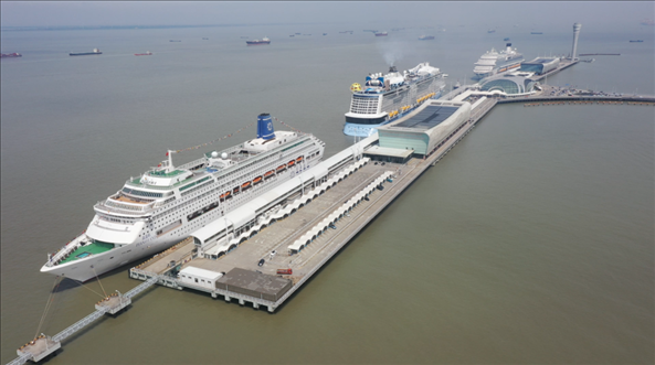 5月22日,“愛達(dá)·魔都號(hào)”“海洋光譜號(hào)”和“鼓浪嶼號(hào)”三艘郵輪??吭趨卿量趪?guó)際郵輪港(無人機(jī)照片)。(上海邊檢總站供圖)