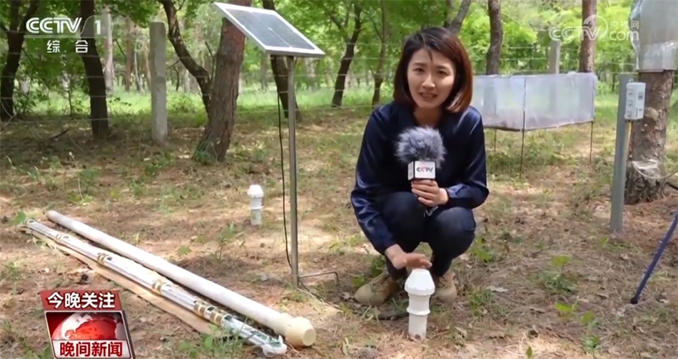要了解樟子松的生長(zhǎng)密碼,單靠監(jiān)測(cè)這一項(xiàng)是不夠的。在整個(gè)林子中,有十幾個(gè)設(shè)備都正在為這片樟子松林做著24小時(shí)不間斷的體檢。像這個(gè)2米長(zhǎng)的大管子,像一個(gè)體溫計(jì),里面在不同深度安裝了6層傳感器。把它直接插到土壤中,就可以監(jiān)測(cè)出地塊土壤的濕度、溫度、鹽分、肥力等。