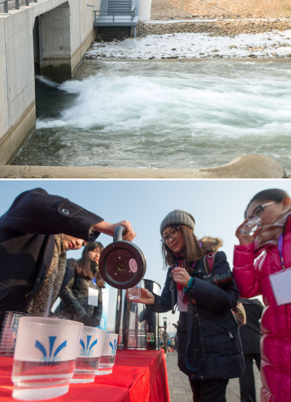2014年12月27日,南水北調中線一期工程總干渠終點團城湖明渠開閘放水(上圖);參加通水儀式的嘉賓在北京品嘗了來自丹江口的水(下圖,拼版照片)。