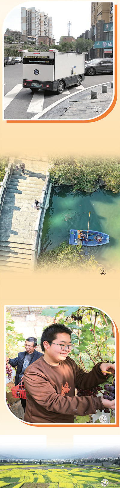 圖①:一輛無人駕駛快遞車行駛在湖北宜昌市夷陵區(qū)小溪塔街道道路上。