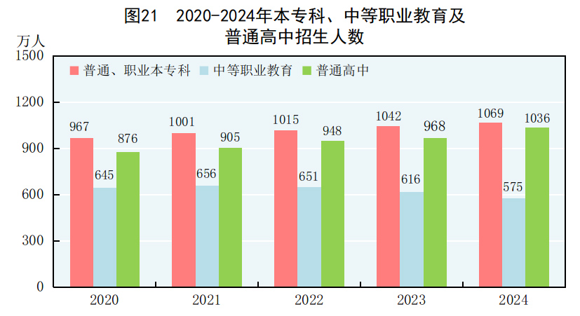 全年研究生教育招生135.7萬(wàn)人,在學(xué)研究生409.5萬(wàn)人,畢業(yè)生108.4萬(wàn)人。普通、職業(yè)本專(zhuān)科[74]招生1068.9萬(wàn)人,在校生3891.3萬(wàn)人,畢業(yè)生1059.4萬(wàn)人。中等職業(yè)教育[75]招生575.4萬(wàn)人,在校生1659.4萬(wàn)人,畢業(yè)生542.2萬(wàn)人。普通高中招生1036.2萬(wàn)人,在校生2922.3萬(wàn)人,畢業(yè)生891.0萬(wàn)人。初中招生1848.8萬(wàn)人,在校生5386.2萬(wàn)人,畢業(yè)生1698.2萬(wàn)人。普通小學(xué)招生1616.6萬(wàn)人,在校生10584.4萬(wàn)人,畢業(yè)生1857.3萬(wàn)人。特殊教育招生15.8萬(wàn)人,在校生91.6萬(wàn)人,畢業(yè)生17.7萬(wàn)人。學(xué)前教育在園幼兒3584.0萬(wàn)人。九年義務(wù)教育鞏固率為95.9%,高中階段毛入學(xué)率為92.0%。