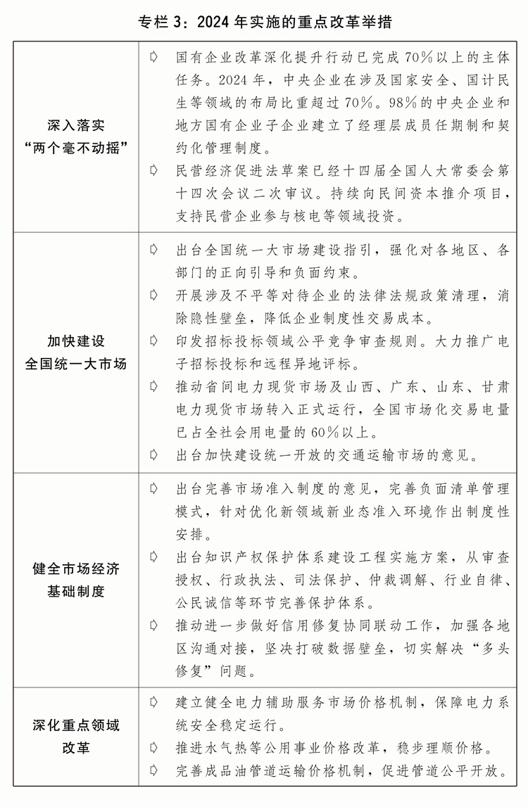 (二)進(jìn)一步全面深化改革,發(fā)展動(dòng)力活力不斷增強(qiáng)。認(rèn)真落實(shí)黨的二十屆三中全會(huì)部署的重要改革舉措,深化經(jīng)濟(jì)體制改革,經(jīng)濟(jì)發(fā)展內(nèi)生動(dòng)力、創(chuàng)新活力持續(xù)激發(fā)。