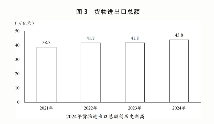 二是外貿(mào)出口對(duì)經(jīng)濟(jì)增長(zhǎng)貢獻(xiàn)增大。出臺(tái)關(guān)于促進(jìn)外貿(mào)穩(wěn)定增長(zhǎng)、拓展跨境電商出口推進(jìn)海外倉(cāng)建設(shè)、推動(dòng)服務(wù)貿(mào)易和數(shù)字貿(mào)易發(fā)展的政策,貨物和服務(wù)凈出口對(duì)經(jīng)濟(jì)增長(zhǎng)的貢獻(xiàn)率達(dá)30.3%。進(jìn)博會(huì)、廣交會(huì)、服貿(mào)會(huì)、投洽會(huì)、中俄博覽會(huì)等重大展會(huì)成功舉辦。出臺(tái)扎實(shí)推進(jìn)高水平對(duì)外開放更大力度吸引和利用外資行動(dòng)方案。發(fā)布外商投資準(zhǔn)入特別管理措施(負(fù)面清單)(2024年版),制造業(yè)領(lǐng)域外資準(zhǔn)入限制措施全面取消。推進(jìn)服務(wù)業(yè)擴(kuò)大開放綜合試點(diǎn)示范,開展增值電信、生物技術(shù)、獨(dú)資醫(yī)院開放試點(diǎn)。發(fā)布實(shí)施全國(guó)版和自貿(mào)試驗(yàn)區(qū)版跨境服務(wù)貿(mào)易負(fù)面清單。推出第八批標(biāo)志性重大外資項(xiàng)目。健全境外投資管理服務(wù)體系。