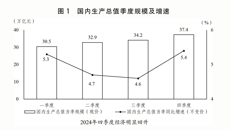 (一)因時(shí)因勢(shì)加強(qiáng)和創(chuàng)新宏觀調(diào)控,推動(dòng)經(jīng)濟(jì)回升向好。扎實(shí)開展宏觀政策逆周期調(diào)節(jié),加大政策力度,釋放政策效能,特別是9月26日中央政治局會(huì)議果斷部署一攬子增量政策,市場(chǎng)預(yù)期、社會(huì)信心有效提振,四季度經(jīng)濟(jì)明顯回升。全年國(guó)內(nèi)生產(chǎn)總值(GDP)134.9萬(wàn)億元、增長(zhǎng)5%,其中,一、二、三產(chǎn)業(yè)分別增長(zhǎng)3.5%、5.3%、5%。