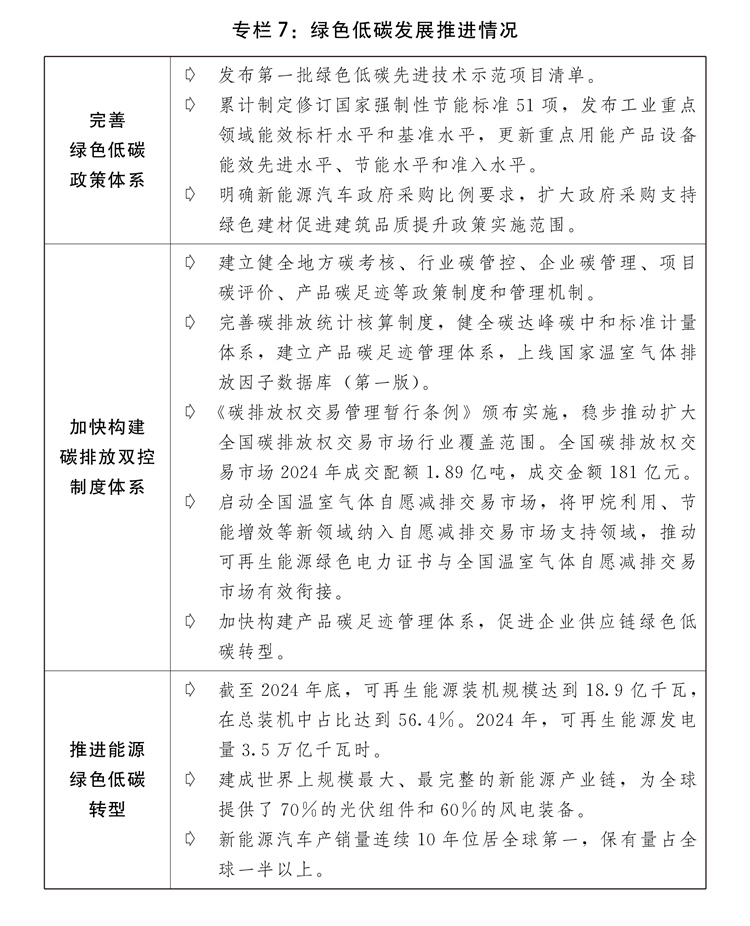 三是加快推動(dòng)綠色低碳發(fā)展。持續(xù)構(gòu)建碳排放雙控制度體系,制定出臺(tái)碳達(dá)峰碳中和綜合評(píng)價(jià)考核辦法,建立健全碳排放統(tǒng)計(jì)核算制度、碳排放預(yù)算管理制度、產(chǎn)品碳足跡管理體系、產(chǎn)品碳標(biāo)識(shí)認(rèn)證制度,豐富完善國(guó)家溫室氣體排放因子數(shù)據(jù)庫(kù)。推動(dòng)全國(guó)碳排放權(quán)交易市場(chǎng)、溫室氣體自愿減排交易市場(chǎng)、綠色電力證書市場(chǎng)建設(shè)。發(fā)布第二批綠色低碳先進(jìn)技術(shù)示范項(xiàng)目清單,扎實(shí)開展第二批國(guó)家碳達(dá)峰試點(diǎn),出臺(tái)零碳園區(qū)建設(shè)方案。延長(zhǎng)碳減排支持工具實(shí)施年限至2027年,有序推進(jìn)碳金融產(chǎn)品和衍生工具創(chuàng)新,發(fā)展綠色保險(xiǎn)。有力有效管控高耗能高排放項(xiàng)目,加快推動(dòng)重點(diǎn)領(lǐng)域節(jié)能降碳改造和用能設(shè)備更新,加強(qiáng)重點(diǎn)用能單位節(jié)能管理,完善節(jié)能降碳標(biāo)準(zhǔn)體系,深入實(shí)施能效標(biāo)識(shí)制度。健全資源環(huán)境要素市場(chǎng)化配置體系。營(yíng)造綠色低碳產(chǎn)業(yè)健康發(fā)展生態(tài),培育綠色建筑、綠色能源、綠色交通等新增長(zhǎng)點(diǎn)。加強(qiáng)煤炭綠色智能開發(fā)、清潔高效利用。統(tǒng)籌新能源開發(fā)與消納,有力有序推進(jìn)集中式和分布式新能源健康發(fā)展,加快“沙戈荒”新能源基地建設(shè),有序開發(fā)建設(shè)海上風(fēng)電基地,統(tǒng)籌就地消納和外送通道建設(shè)。大力實(shí)施可再生能源替代行動(dòng)。推進(jìn)煤電低碳化改造示范。進(jìn)一步規(guī)范新型儲(chǔ)能并網(wǎng)管理,持續(xù)完善調(diào)度機(jī)制。實(shí)施全面節(jié)約戰(zhàn)略,持續(xù)推動(dòng)“能水糧地礦材”一體化節(jié)約,深入實(shí)施國(guó)家節(jié)水行動(dòng)。大力發(fā)展循環(huán)經(jīng)濟(jì),加強(qiáng)廢棄物循環(huán)利用,推廣再生材料使用。