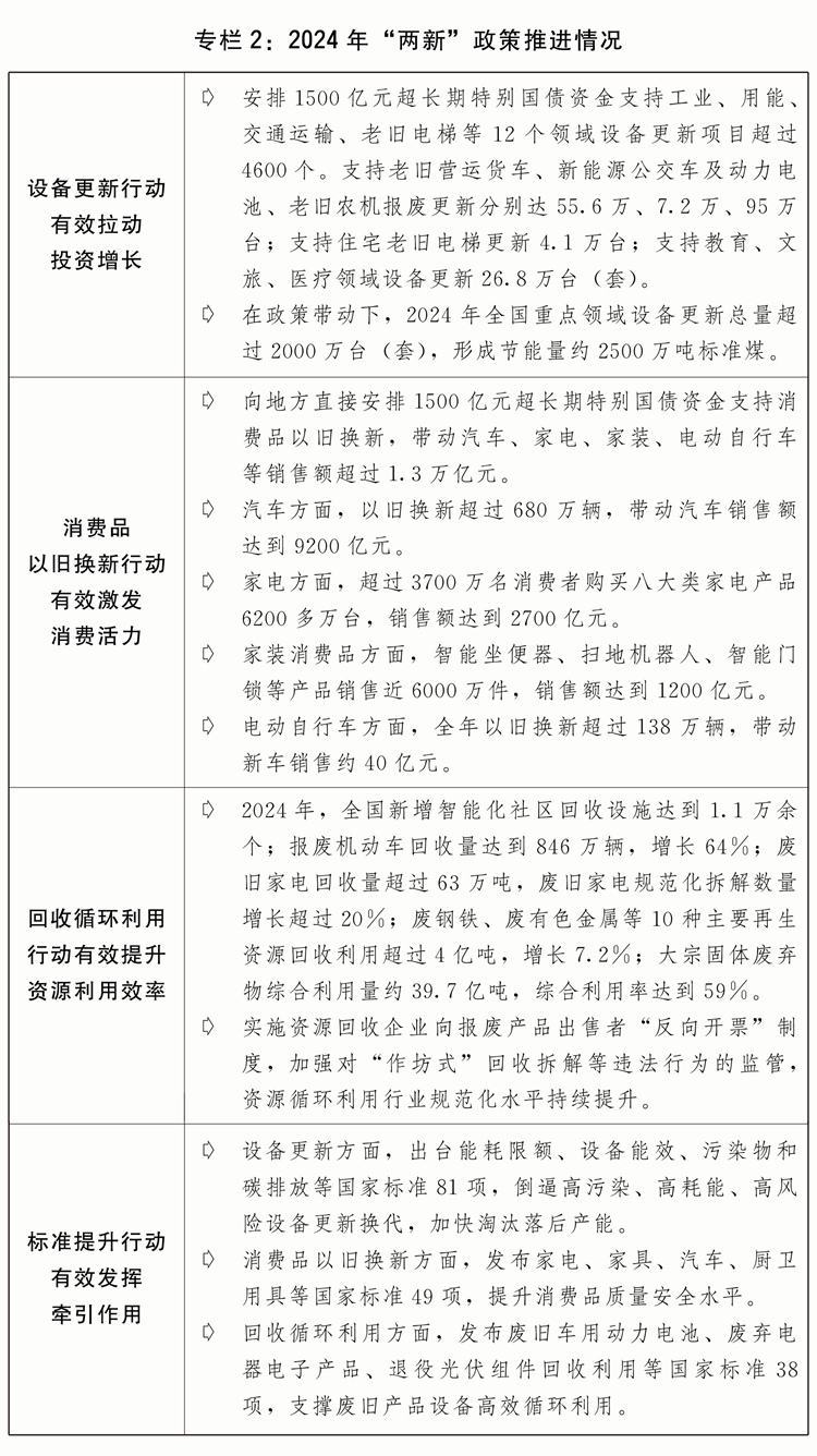 三是大規(guī)模設(shè)備更新和消費(fèi)品以舊換新政策落地見效。印發(fā)“兩新”行動(dòng)方案,出臺(tái)工業(yè)、建筑市政、交通、農(nóng)業(yè)、教育、文旅、醫(yī)療等七大領(lǐng)域設(shè)備更新實(shí)施方案和消費(fèi)品以舊換新、回收循環(huán)利用、標(biāo)準(zhǔn)提升引領(lǐng)行動(dòng)方案。安排3000億元超長(zhǎng)期特別國(guó)債加力支持“兩新”工作。2024年,“兩新”政策帶動(dòng)全國(guó)設(shè)備工器具購(gòu)置投資增長(zhǎng)15.7%,高于固定資產(chǎn)投資(不含農(nóng)戶)增速12.5個(gè)百分點(diǎn);限額以上單位家用電器和音像器材類、家具類商品零售額分別增長(zhǎng)12.3%、3.6%,帶動(dòng)大宗耐用消費(fèi)品銷售額超過(guò)1.3萬(wàn)億元;消費(fèi)品以舊換新活動(dòng)中,新能源汽車銷量占比超過(guò)60%,一級(jí)能效家電銷售額占比超過(guò)90%。
