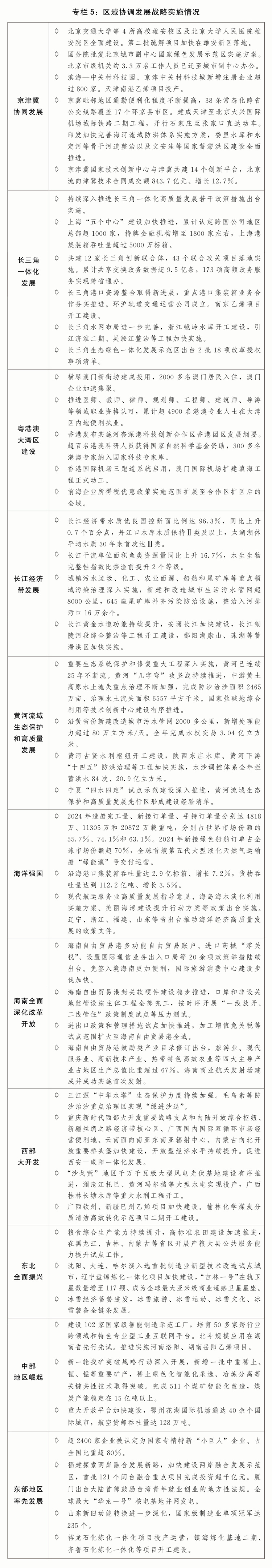 一是區(qū)域協(xié)調(diào)發(fā)展積厚成勢(shì)。京津冀協(xié)同發(fā)展走深走實(shí),在京相關(guān)高校、醫(yī)院、中央企業(yè)總部及二三級(jí)子公司分批向雄安新區(qū)疏解,北京城市副中心行政辦公、商務(wù)服務(wù)、文化旅游等功能不斷完善,進(jìn)一步支持天津?yàn)I海新區(qū)高質(zhì)量發(fā)展若干政策措施出臺(tái)實(shí)施,三省市互聯(lián)互通交通網(wǎng)絡(luò)更加完善、產(chǎn)業(yè)鏈上下游協(xié)作持續(xù)強(qiáng)化、公共服務(wù)共建共享水平進(jìn)一步提升。長(zhǎng)三角一體化高質(zhì)量發(fā)展深入推進(jìn),生態(tài)綠色一體化發(fā)展示范區(qū)改革授權(quán)壓茬推進(jìn),港口資源整合、軌道互聯(lián)互通等取得新進(jìn)展,上?!拔鍌€(gè)中心”建設(shè)進(jìn)一步加快?;浉郯拇鬄硡^(qū)建設(shè)邁上新臺(tái)階,橫琴粵澳深度合作區(qū)封關(guān)“一線”“二線”分線管理運(yùn)行順利,超1.6萬(wàn)名澳門居民在合作區(qū)居住生活,支持河套深港科技創(chuàng)新合作區(qū)深圳園區(qū)、香港園區(qū)聯(lián)動(dòng)發(fā)展,創(chuàng)新要素跨境流動(dòng)更加便捷。長(zhǎng)江經(jīng)濟(jì)帶共抓大保護(hù)、不搞大開發(fā)成效顯著,進(jìn)一步抓實(shí)抓好長(zhǎng)江大保護(hù)工作三年行動(dòng)計(jì)劃出臺(tái)實(shí)施,長(zhǎng)江十年禁漁取得明顯成效,長(zhǎng)江干流連續(xù)5年保持Ⅱ類水質(zhì),綜合立體交通走廊加快構(gòu)建,沿江高鐵全線開工建設(shè)。黃河流域生態(tài)保護(hù)和高質(zhì)量發(fā)展邁出堅(jiān)實(shí)步伐,農(nóng)業(yè)面源、城鎮(zhèn)生活、工業(yè)和尾礦庫(kù)污染治理深入推進(jìn),8萬(wàn)余個(gè)入河排污口開展溯源整治,一批生態(tài)保護(hù)修復(fù)重點(diǎn)項(xiàng)目加快建設(shè),黃河干流連續(xù)3年保持Ⅱ類水質(zhì)。海洋強(qiáng)國(guó)建設(shè)深入推進(jìn),海洋強(qiáng)省、現(xiàn)代海洋城市、全國(guó)海洋經(jīng)濟(jì)發(fā)展示范區(qū)創(chuàng)新發(fā)展,海洋生態(tài)環(huán)境質(zhì)量持續(xù)改善,海洋生產(chǎn)總值超10萬(wàn)億元。