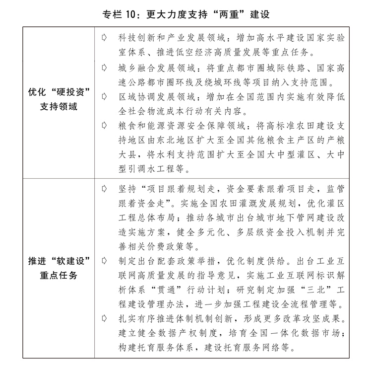 三是加力推進(jìn)“兩重”建設(shè)。進(jìn)一步完善自上而下的工作機(jī)制,加強(qiáng)“兩重”建設(shè)項(xiàng)目?jī)?chǔ)備,更好統(tǒng)籌“硬投資”與“軟建設(shè)”。安排超長(zhǎng)期特別國(guó)債8000億元支持“兩重”建設(shè),進(jìn)一步優(yōu)化具體投向并提高項(xiàng)目支持比例,重點(diǎn)支持基礎(chǔ)研究能力提升、未來(lái)產(chǎn)業(yè)發(fā)展、東北等重點(diǎn)地區(qū)高標(biāo)準(zhǔn)農(nóng)田建設(shè)、大中型灌區(qū)新建改造及大中型引調(diào)水和大中型水庫(kù)建設(shè)、長(zhǎng)江經(jīng)濟(jì)帶生態(tài)環(huán)境保護(hù)和綠色發(fā)展、農(nóng)業(yè)轉(zhuǎn)移人口市民化公共服務(wù)體系建設(shè)、高等教育提質(zhì)升級(jí)、城市地下管網(wǎng)管廊建設(shè)改造等方面任務(wù),強(qiáng)化超長(zhǎng)期貸款等配套融資,高質(zhì)量推進(jìn)“硬投資”項(xiàng)目謀劃實(shí)施。加大力度推動(dòng)“軟建設(shè)”政策落地見效。