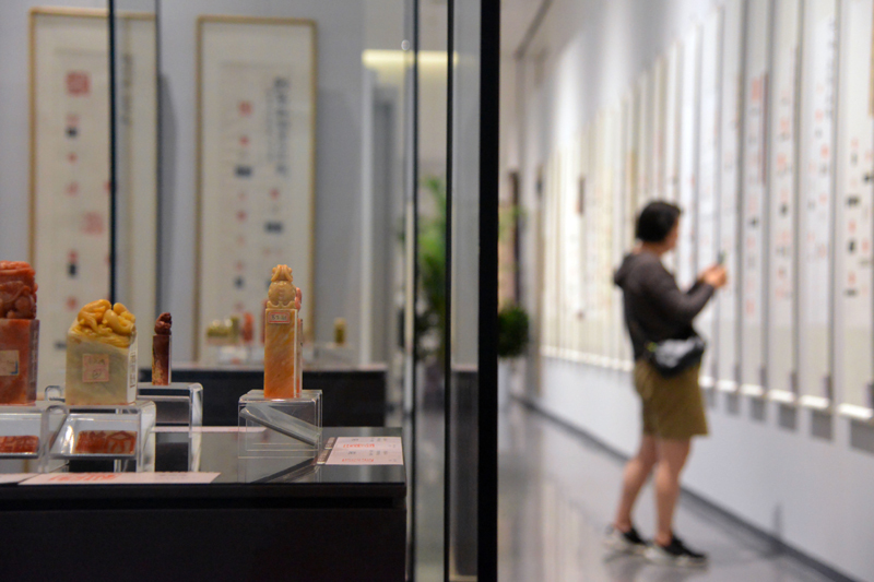 6月21日,觀眾在北京市海淀區(qū)三山五園文化藝術(shù)中心參觀薪傳國(guó)粹——“萬印樓”新藏當(dāng)代國(guó)際篆刻精品展。