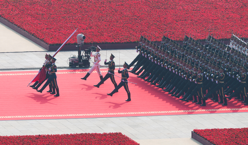 9月3日,紀念中國人民抗日戰(zhàn)爭暨世界反法西斯戰(zhàn)爭勝利80周年大會在北京隆重舉行。這是走向旗桿基座的國旗護衛(wèi)隊。