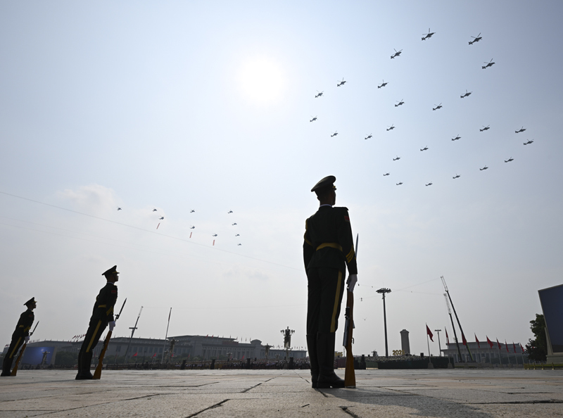 9月3日,紀(jì)念中國(guó)人民抗日戰(zhàn)爭(zhēng)暨世界反法西斯戰(zhàn)爭(zhēng)勝利80周年大會(huì)在北京隆重舉行。這是空中護(hù)旗梯隊(duì)飛過(guò)天安門廣場(chǎng)上空,26架直升機(jī)匯成巨大的“80”字樣。
