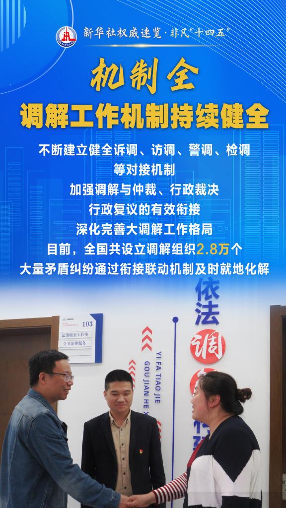 “十四五”期間,司法部堅持和發(fā)展新時代“楓橋經(jīng)驗”,充分發(fā)揮調(diào)解職能作用,以“機制全、領域廣、隊伍強、效果實”十二字為工作“秘訣”,大力加強矛盾糾紛排查化解,切實保障群眾合法權(quán)益,維護社會和諧穩(wěn)定。