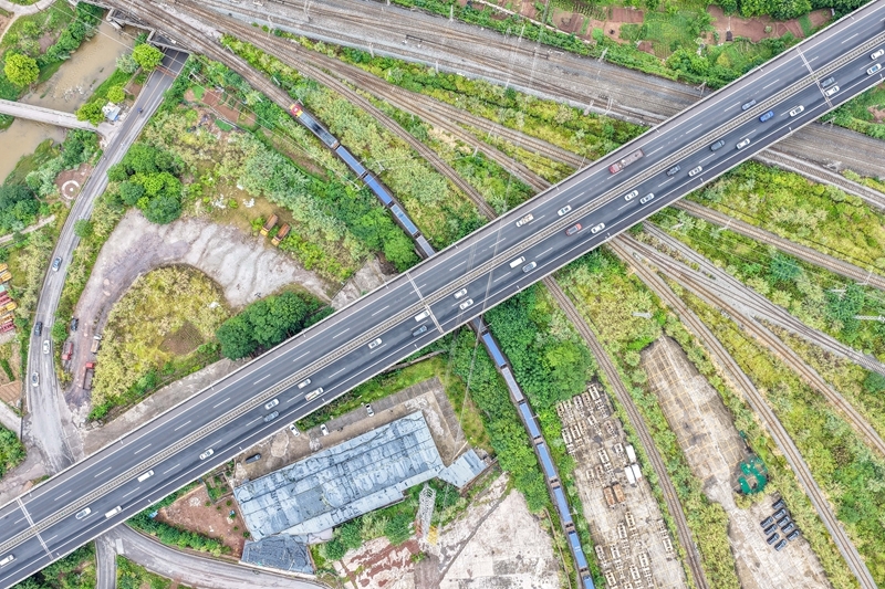 9月8日,滿載“重慶造”汽車的中歐班列(成渝)在重慶團結(jié)村中心站順利發(fā)車(無人機照片)。
