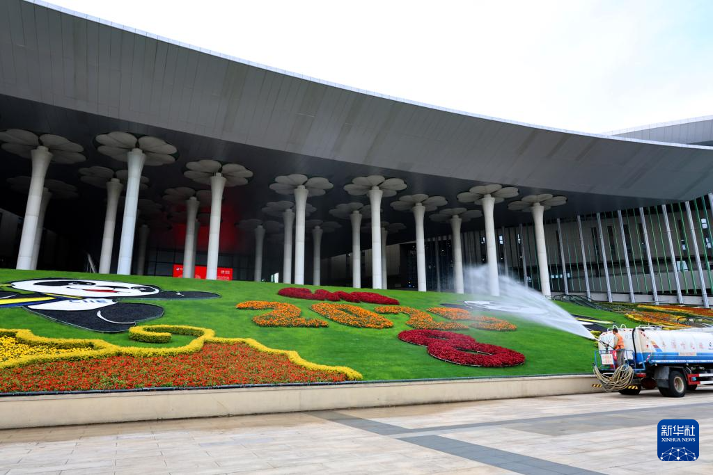 11月3日,工作人員在為國家會(huì)展中心(上海)南廣場裝飾綠化噴水。