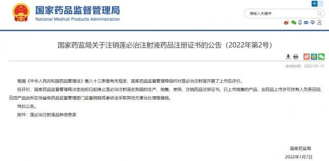 據國家藥監(jiān)局網站消息,國家藥品監(jiān)督管理局11日發(fā)布公告,決定自即日起停止蓮必治注射液在我國的生產、銷售、使用,注銷藥品注冊證書。已上市銷售的產品,由藥品上市許可持有人負責召回,召回產品由所在地省級藥品監(jiān)督管理部門監(jiān)督銷毀或者依法采取其他無害化處理等措施。