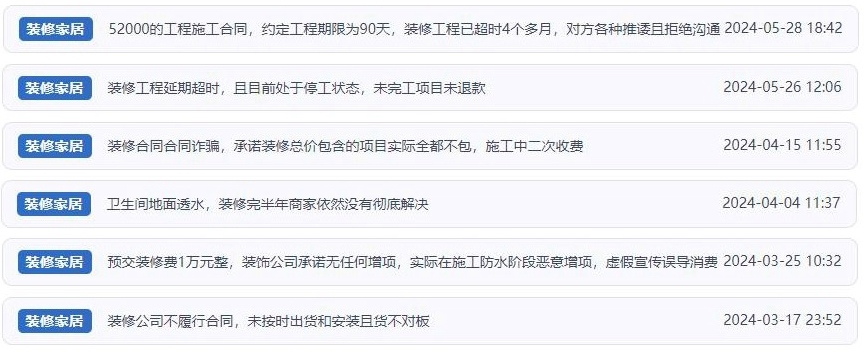 其實(shí),有著同樣遭遇的消費(fèi)者不在少數(shù)。公開(kāi)報(bào)道顯示,今年以來(lái)有多個(gè)家裝機(jī)構(gòu)分公司或經(jīng)銷商跑路,還有個(gè)別不良裝修公司在短時(shí)間內(nèi)聚收大量預(yù)付款后攜款跑路,給消費(fèi)者帶來(lái)經(jīng)濟(jì)財(cái)產(chǎn)損失?!叭嗣裢对V”梳理發(fā)現(xiàn),除閉店跑路外,目前平臺(tái)上涉及家裝消費(fèi)類的投訴問(wèn)題多聚焦于——
