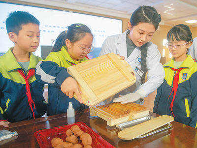 河北省滄州中西醫(yī)結(jié)合醫(yī)院,中藥師(右二)在為小學(xué)生演示中藥蜜丸的制作工藝。