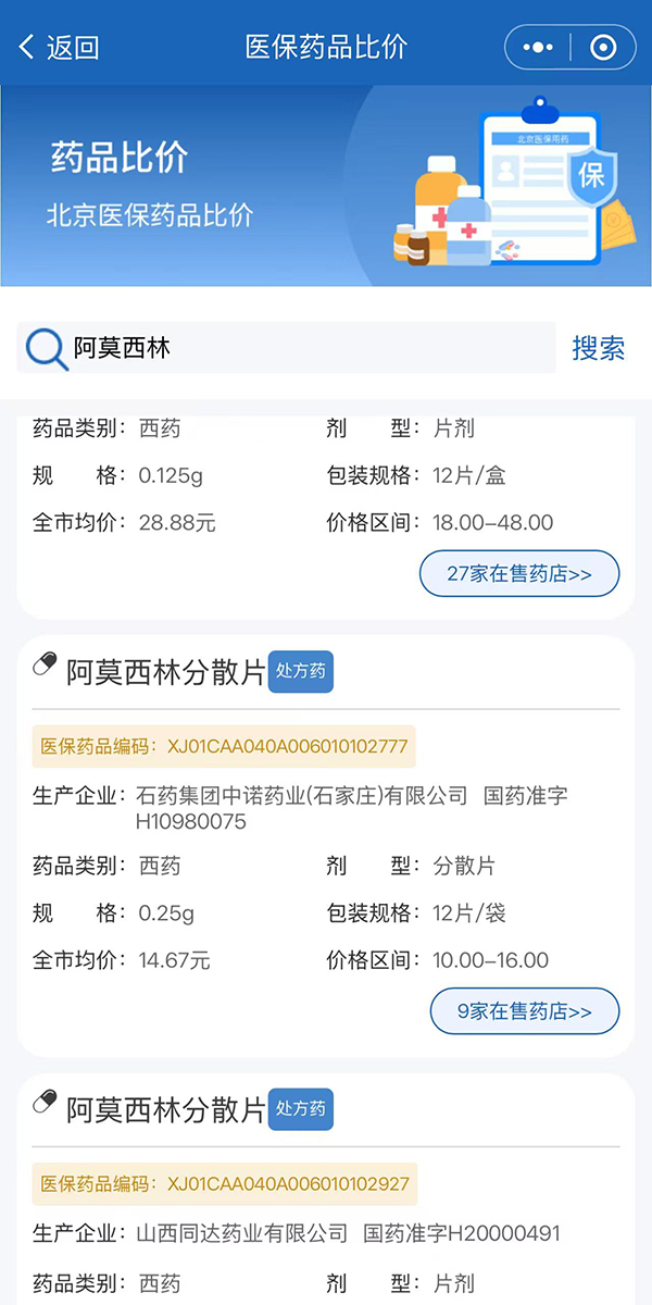 第四步:以搜索阿莫西林為例,可以看到下方展示了在售的相關(guān)商品及價(jià)格等信息。