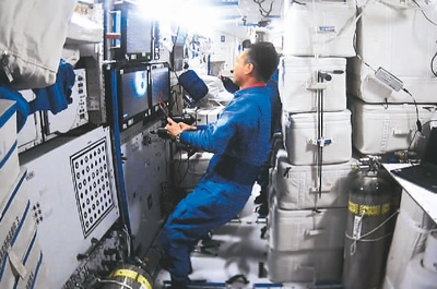 5月11日,天舟六號(hào)貨運(yùn)飛船與空間站組合體完成交會(huì)對(duì)接后,天和核心艙內(nèi)的畫面。 新華社記者 郭中正攝